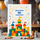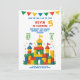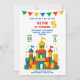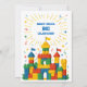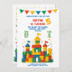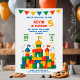Um design de aniversário lúgubre com um castelo de blocos brilhante, faixas festivas e detalhes alegres, perfeito para uma celebração divertida e criativa de crianças.