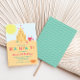 Festa de praia, aniversário de verão com convite para castelos de areia.