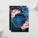 Uma floral tropical sob as estrelas Quinceañera, 15 (ou qualquer idade) convite de aniversário com flores de hibisco cor-de-rosa, verde-verde e uma falsa estrutura geométrica dourada. Um céu azul escuro com lua de cheio e estrelas como fundo. Modelos para um nome escrito com um script de estilo manuscrito moderno, modelos para suas informações de partido. Texto branco. Perfeito para uma festa de verão, piscina ou praia! Verso: céu azul e estrelas como fundo.