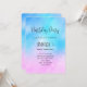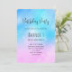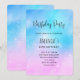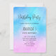Convite de aniversário com um fundo caprichoso. Uma paleta de cores com gradiente pastel rosa e azul. Pequenas estrelas brancas espalhadas por todo o lado. Design mágico e caprichoso.