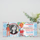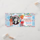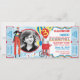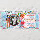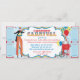 Malabarismo e cabine de algodão doce Stilt Walker com balões circo ou cartão-convite de aniversário de tema de carnaval com fotografia e bilhetes de rifle ao lado. Apenas perfure os lados para uma fácil rasga! As cores são azuis, amarelo, vermelho e branco.