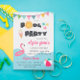 Convite de festas divertida para o aniversário de uma criança com um anel de natação flamingo rosa e uma bola de praia flutuando na água. Um sol brilhante substituiu um dos o na piscina e o texto é encurralado por um cone sorvete e três estrelas de estrelas sob uma faixa colorida.