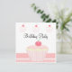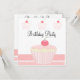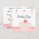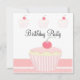 Um cupcake cor-de-rosa macio com um revestimento rosa e uma cereja no topo. Uma fileira desses cupcakes através do topo e uma borda de listras ao longo da base em rosa com pequenas bolinhas. Personalize com todas as informações de aniversário conforme desejado.