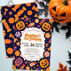 Este divertido convite de aniversário de Halloween é um banquete para os olhos. Ele tem um fundo roxo rico com uma dança lúdica de sorriso de jack-o-lanternas e uma borda festiva de doces irregulares e doces embrulhados. A fonte laranja brilhante coloca o nome e a idade do seu filho à frente e ao centro, fazer a maneira perfeita de começar uma celebração assustadora.