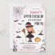 Celebre o Dia das Bruxas com este Convite de Aniversário do Dia das Bruxas Rosa! Apresentando uma encantadora bruxa criança em uma roupa rosa, acompanhada por seu gato preto, morcego, teia de aranha, estrelas e uma lua brilhante, esta design é perfeita para uma celebração mágica de aniversário do Dia das Bruxas. O fundo cor-de-rosa suave adiciona um toque divertido e caprichoso, fazer ideal para a festa temerária de uma criança. BRT131
