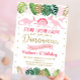 Este adorável convite de aniversário apresenta folhas de aquarela tropicais com embelezamentos de folhas com brilho dourado e dinossauros cor-de-rosa.