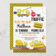 Este belo convite de aniversário inclui caminhões de construção e confete colorido.