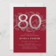 Elegante convite de aniversário de 80 de prata vermelha. Design feminina moderna personalizável, com sotaques botânicos rosas e prata brilhante fraca. Simples cartão de convite floral perfeito para uma comemoração de um na moda. Personalize com seus próprios detalhes. Impressos convites Zazzle ou modelo de impressão digital instantânea para download.