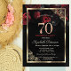 Um convite moderno, chico e glamouroso com rosas vermelhas elegantes sobre fundo negro.