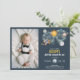 Celebre o marco especial do seu filho com este convite de aniversário de tema do espaço sideral mágico. Apresentando planetas imaginários, luas e estrelas em marinho e mira dourada. Coloque sua foto de bebê no convite. Estas estrelas de galáxia solar e planetas são perfeitas para uma festa de aniversário simples. O moderno design whimsical mostra um fundo de marinho-azul-aquarela adornado com um sol vibrante amarelo, lua de cinza sorridente, planetas de cor pastel e estrelas de brilho dourado dispersas. Foto do bebê gerada pelo Freepik.