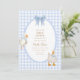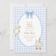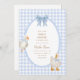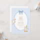 Um ganso bobo está comemorando seu aniversário! Este design apresenta um padrão de xadrez azul, arcos azuis e pequenos gansos.