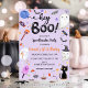 Ei, Boo! Ghost Themed Halloween Invitation Nosso design apresenta os detalhes do evento exibidos no centro, enquadrado pelo nosso divertido tema do Dia das Bruxas azuis, teias de aranha e morcegos...