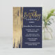 Barras de folha de ouro, modernas, elegantes, artísticas e simples e falsas impressas em um fundo azul marinho, Convites de aniversário. Este design clássico e sofisticado é perfeito para o indivíduo clássico, na moda, e tradicional de aniversário. Personalize com sua própria mensagem na frente e personalize o monograma no verso. Todas as impressão design.
