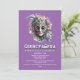 O rosto de uma mulher bonita com pele branca de porcelana e lábios vermelhos tem flores florais cor-de-rosa bonito em seu cabelo azul claro e cinza. Ela está vestindo uma marca de orante preto e branco e uma pluma de penas. Este gráfico de aquarela é definido contra um fundo bonito roxo que tem modelos de texto brancos editáveis nele. Este elegante gráfico de aquarela é ideal para uma despedida de solteira, aniversário, 16 ou quinceanera. Simplesmente personalize os modelos de texto editáveis para se adequar à sua ocasião especial.