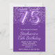 Crie o seu aniversário moderno de 75 anos com a arte digital falsa de balões de folhas. Envie uma mensagem ao criador se precisar de um convite para uma idade diferente criada. O fundo de vidro feminino apresenta gráficos decorativos de brilho roxo roxo roxo brilhante e brilhante sobre uma cor sólida correspondente. O brilho luxuoso, o brilho e os efeitos de texto em folha são criados por elementos artísticos que impressão gostam de uma foto. Você pode personalizar a caligrafia caprichosa e modernos todos os estilos de fonte e cores de bonés.