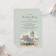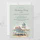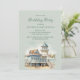 Convite de aniversário feminino com pintura aquarela de uma bela casa de praia/campo litoral com palmeiras
