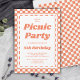 Um convite de aniversário para uma festa de piquenique neutra do sexo moderno com um padrão de cheque de laranja retrorreflector. Personalize-o com os detalhes do seu partido, informações de RSVP e quaisquer detalhes que você queira incluir. Produtos correspondentes disponíveis.