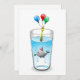Convite de aniversário de piscina com uma bela ilustração de uma baleia. A baleia está vestindo um chapéu de festas listradas vermelho e branco e começou a festa de aniversário que acontece em um copo d'água cheio.