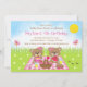 Este convite de aniversário fofo e caprichoso apresenta ursos adoráveis tendo um piquenique num pano de gingham rosa com doces como mel, melancia, compota de morango, limonada e torta. Ao fundo está um céu azul brilhante e sol, borboletas e margaridas. O texto combina fontes decorativas e serif para um aspecto na moda e moderno. Isto é perfeito para primavera ou festa de aniversário de verão.