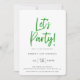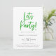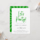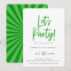 Partido do Vamos de script moderno! Modelo de design de tipografia verde e preta. A parte traseira da carta apresenta um padrão legal de rajada solar retrorreflectora na coordenação das cores verdes.