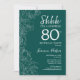 Convite de Aniversário para 80 de Surpresa Verde Teal. A design feminina moderna minimalista apresenta sotaques botânicos e letra de script de tipografia. Simples cartão de convite floral perfeito para uma festa surpresa na moda.