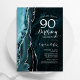 Convite de aniversário de 90 de gás lacrimogêneo e prateado. Elegante design moderno, com cor aquática turquesa agate marble geode background, faux glitter prata e script de tipografia. Trendy convida o cartão perfeito para uma comemoração de dia das mulheres na moda. Impressos convites Zazzle ou modelo de impressão digital instantânea para download.