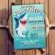 Convite de aniversário em formato de tubarão com um design de tubarão fofo e uma redação "Fin-tastic" divertida, perfeita para festas de aniversário infantis. Personalize-o com o nome, a idade, os detalhes da festa e muito mais. Excelente para o 4º aniversário ou qualquer celebração inspirada no oceano.