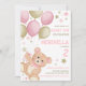 Um convite para festas de aniversario de meninas cor-de-rosa e dourado apresenta um ursinho de pelúcia a aquarelas voando em um pacote de balões com um borrifo de estrelas, convidando convidados para uma "Celebração da Diversão Beary". Trabalho de arte por KL Stock.