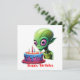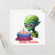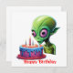 Esta é uma imagem engraçada de uma celebração de aniversário de uma alienígena, completa com um bolo e velas.