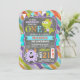 Monstrinhos bonitos e assustadores no fundo do chalkboard com carta de convite de design de aniversário colorido de stripe colorida.