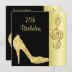 Mulheres personalizadas, cartões de aniversário feitos sob encomenda elegantes do 70 com glitz e encanto. O ouro bonito da mulher e o convite tomado partido dobro preto do aniversário com os cristais de rocha glamoroso impressionantes de uma imagem impressa, o brilho, os sequins, os diamantes que bling calçados da forma dos estiletes dos saltos altos da faísca das jóias, e triplo glittery do ouro fenderam-se em um preto e em um fundo do ouro. O reverso deste aniversário feminino bonito convida tem o mesmo design com bastante espaço para que você personalize com seus detalhes do evento. Chique, cartões elegantes, bonitos, femininos, modernos para festas de aniversário, em cores na moda, elegantes/cores. Estes groovy, extravagante, à moda, sofisticado, bonito, cartões do girlie são decorados/imprimidos em ambos os lados. NOTE POR FAVOR: Todos os produtos em Zazzle têm imagens impressas do plano.