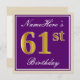 Este simples e bolsa mensageifesta de aniversario elegante de convite apresenta uma mensagem personalizada, como "NameHere's 61rua Birthday" (com a "61ruas" a ter um visual falsa/imitado de cor dourada), dentro de uma área quadrada de cor púrpura com um contorno simples de fronteira. O nome está em um texto elegante, de cor branca, semelhante a script, e pode ser personalizado. A parte traseira apresenta detalhes de convite personalizáveis. Um convite de aniversário como este poderia talvez ser usado ao convidar pessoas para uma festa de aniversário em prisão preventiva para alguém que comemora seu sessenta aniversário. [~Z0000226]