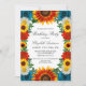 Design floral elegante e colorido para um evento de verão no quintal. Apresenta rosas azuis, margaridas brancas, flores silvestres vermelhas e girassóis