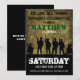 Convites personalizados de aniversário infantil com tema militar com um fundo de camuflagem rústica e uma silhueta de soldados e fonte militar, personalize os detalhes no lado direito da tela com suas próprias informações.