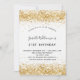 Para uma elegante festa de aniversário 40th (ou qualquer idade). Um fundo branco chic. Decorado com brilho de ouro falso, brilhos. Personalize e adicione um nome, idade e detalhes da festa. O nome é escrito com um script de estilo manuscrito