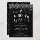 Convite para aniversário de 30 anos. Até 30 Anos! Design elegante em preto, branco e prata brilhante fraca. Apresenta óculos de champanhe, fonte de script e confetti. Perfeito para na moda e trigésima festa de aniversário. Personalize com seus próprios detalhes. Pode ser personalizado para mostrar qualquer idade.