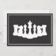 Este sofisticado design de convites de aniversário apresenta um esquema de cores preto e branco com bordas em negrito. A frente apresenta uma peça de xadrez rainha. A parte de trás apresenta uma linha em forma de v de peças de xadrez para incluir a rainha, bispos, cavaleiros e torres.