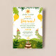 o design da frente mostra um belo convite de aniversário para crianças escritas em caligrafia verde-sábio e amarela e tipografia com antecedentes com dinossauro, balão, bolo, estrelas e natureza verde. este design será ideal para qualquer aniversário de criança.