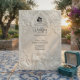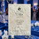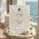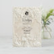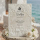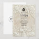 Anuncie sua união com a grandiosidade atemporal da arte do século XVII. Este design evoca o romance de uma catedral europeia, perfeito para casais tradicionais. Este design apresenta um sofisticado efeito de falso baixo-relevo, simulando a aparência de pedra antiga esculpida em uma paleta monocromática de tons quentes de creme, marfim e bege. A composição é emoldurada por um arco arquitetônico clássico adornado com elaborados arabescos de acanto e rosas. No cabeçalho, uma delicada ilustração retrata um anjo barroco tocando violino, ladeado por dois cisnes graciosos voltados um para o outro, simbolizando a parceria eterna. Um ícone sutil com a silhueta dos noivos fixa o texto. Esta é uma imagem impressa plana com efeito de textura de pedra, não material real elevado ou relevo 3D.