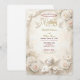 Anuncie sua união sagrada com a grandiosidade eterna do Renascimento. Este design apresenta estética celestial e flores luxuriantes para um tom verdadeiramente romântico. Uma composição visual intrincada inspirada na arquitetura clássica europeia. O design apresenta um efeito de relevo escultural falso, simulando a aparência de pedra talhada e moldura arquitetônica em tons de champanhe suave e bege. Uma vinheta central apresenta uma ilustração delicada de um querubim tocando violino, acompanhado por pombas brancas em voo e aglomerados luxuriantes de rosas creme e rosa. O fundo imita uma superfície de mármore texturizada, enquanto a tipografia simula o brilho de folha de ouro. Esta é uma imagem impressa plana com efeito de pedra e ouro falso, não material realçado, relevo ou folha metálica.
