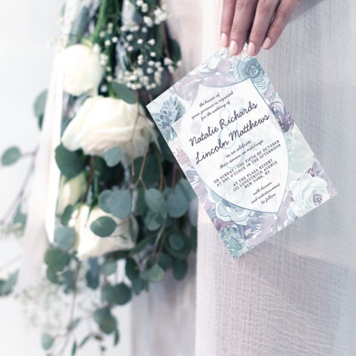 Annabelle Vintage Blue Floral Watercolor Crest Design com flores pintadas à mão, peonias, rosas e detalhes da aquarela, tudo em estilo antigo e antiquado. Um Chic e uma Trendy Procure um primavera, verão, ou casamento no inverno, com paleta de cor pastel suave: azul Marinho, roxo lavanda, cor-de-rosa pincelado e verde-menta, com detalhes empoeirados de folha azul-gelo. Além de uma fonte de Script manuscrito moderno - Convites personalizados para casamento! Veja meu compro para ver a suíte de casamento inteira para este design!