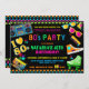 Convite de aniversário divertido e colorido, com fundo preto com texto e itens coloridos néon brilhantes de volta aos anos 80 (estéreo, fita cassete, treinadores, skates de rolo e óculos de sol de cor brilhante).