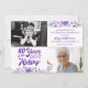 Comemore qualquer aniversário com este convite com flores de aquarela roxas e um título retro tipográfico editável # ANOS NO FAZER (mostrado para uma criança de 80 anos) que incorpora seu ano de nascimento no design e 2 fotos (talvez escolha THEN e AGORA fotos para um convite divertido e memorável. Os detalhes do convite de festas estão atrás. ASSISTÊNCIA: para obter ajuda com a modificação/personalização do design, alteração de cor, transferência do design para outro produto ou, se você quiser coordenar itens, entre em contato com o designer ANTES DE ENCOMENDAR através da guia MENSAGEM de bate-papo Zazzle ou por e-mail em makeitaboutyoustore@gmail.com.