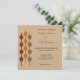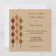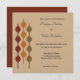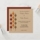 Este convite para o casamento tem um estilo retrô inspirado no design dos anos 70 e apresenta um gráfico geométrico em vermelho-escuro, laranja e vermelho-escuro contra fundo cor de bronzeado. O reverso é uma cor burgundy coordenadora. O esquema de cores do outono e do outono é perfeito para os eventos do outono com um estilo de colheita.