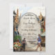 Cartões únicos de convite para o casamento que contêm a arte gerada por IA de Anton Pieck sobre a antiga pintura do Mercado de Amsterdã com alguns modelos modernos e gatos pretos para torná-la um design único
