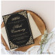 Defina o tom do seu dia de casamento com este cartão de cerimônia Nikah islâmica muçulmana preto elegante. Um fundo escuro e simples permite que cada detalhe dourado brilhe. Em cada canto, delicados floreios rococó se desdobram - folhas curvas e trabalho de pergaminho antigo que emolduram o convite para dar um toque elegante e real. No topo, caligrafia árabe religiosa. Abaixo dela, as palavras "Cerimônia Nikah" são escritas em uma fonte estilosa dourada, guiando imediatamente seus convidados ao coração desta celebração de casamento.