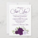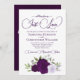 Este belo convite de casamento bócio apresenta um aglomerado de rosas de aquarela pintadas manualmente em tons de roxo, lavanda e ameixa, juntamente com o verde de folhas de eucalipto. O título está escrito em letras ricos e diz: Nada de Rico, Apenas Amor! A parte de trás tem uma seção de detalhes com um código QR personalizável onde você pode direcionar seus convidados para uma página da Web para obter mais informações e/ou RSVP. Apresenta um buquê das mesmas flores com um arco de cetim que flui, sobre um fundo púrpura profundo e marmoreado.