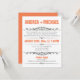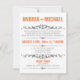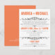 Convites modernos projetados para casamentos em que o casal tem um casamento em um destino ou uma pequena cerimônia de casamento privada, e convida os convidados apenas para a celebração da Recepção. A tipografia na frente desses convites é projetada em fontes laranja e cinza, e o verso é uma laranja sólida com texto branco opcional para possíveis informações de RSVP.