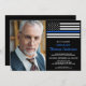 Convites de aposentadoria da polícia de linha azul fina. Celebre anos de serviço dedicado e convide amigos e familiares para a sua festa de aposentadoria na polícia com este Convite para aposentadoria da Polícia de Sinalizador Azul Thin. DESIGN americano na Polícia de Sinalizador, cores modernas, preto branco e design azul. Este convite para aposentadoria de policial também é perfeito para convites para formatura na academia de polícia, mudança de local na personalização. Veja nossa coleção para combinar presentes de aposentadoria da polícia, favoritos para festas de aposentadoria da polícia e suprimentos. COPYRIGHT © 2021 Judy Burrows, Black Dog Art - Todos Os Direitos Reservados. Convite Personalizado para Retirada de Fotografias do Agente Policial Moderno