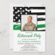 Convites de aposentadoria militar de linha verde fina ou Convites de festas militares que saem. Estes convites de festas do Exército da Linha Verde fina são perfeitos para uma aposentadoria militar, destacamentos militares são enviados, bem-vindos militares para a celebração de casa, graduação militar e soldados indo embora para a festa. A bandeira fina da linha verde representa todos os militares, militares, proteção de fronteiras, patrulha de fronteira, oficial de conservação, guarda florestal, diretor de jogos, polícia federal. Personalize este convite da bandeira militar com o evento, nome e detalhes da festa dos soldados. Veja nossa coleção para combinar presentes de aposentadoria militar, presentes de graduação militar, favoritos para festas e suprimentos. COPYRIGHT © 2021 Judy Burrows, Black Dog Art - Todos Os Direitos Reservados. Convite para Retirada de Fotografias Personalizadas de Linha Verde Fino Militar